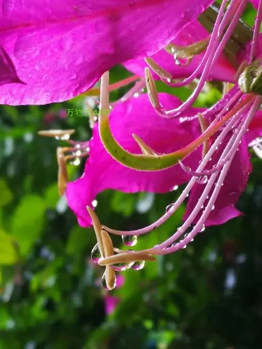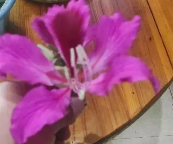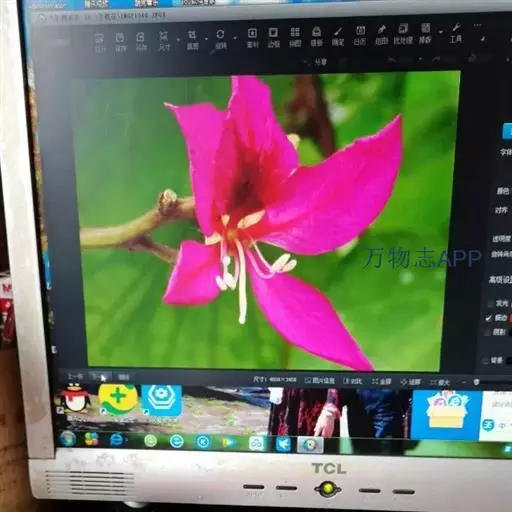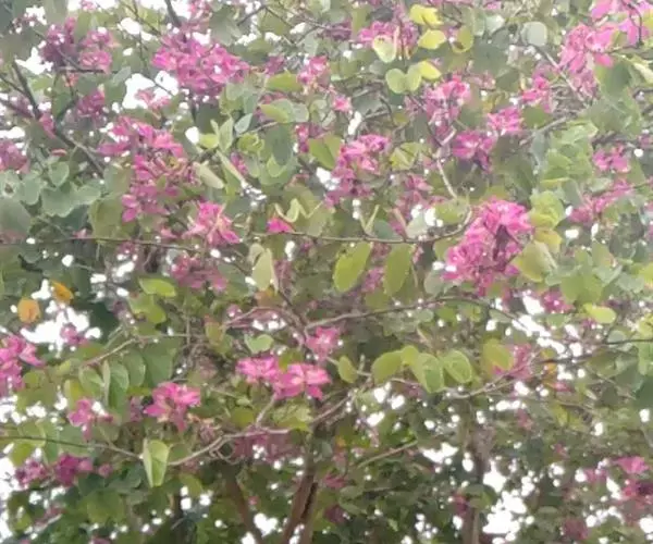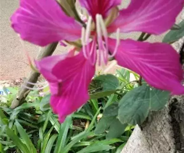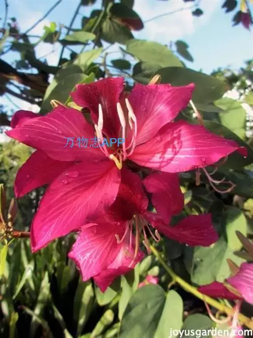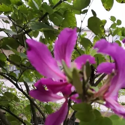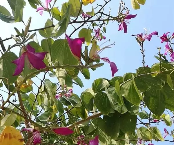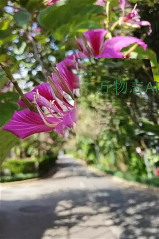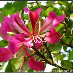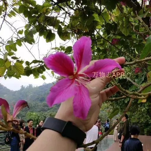 红花羊蹄甲(学名:Bauhinia blakeana Dunn):常绿乔木,树高6-10米。叶革质,圆形或阔心形,长10-13厘米,宽略超过长,顶端二裂,状如羊蹄,裂片约为全长的1/3,裂片端圆钝。 总状花序或有时分枝而呈圆锥花序状;红色或红紫色;花大如掌,10-12厘米;花瓣5,其中4瓣分列两侧,两两相对,而另一瓣则翘首于上方,形如兰花状;花香,有近似兰花的清香,故又被称为“兰花树”。花期十一月至翌年四月。花大如掌,略带芳香,五片花瓣均匀地轮生排列,红色或粉红色,十分美观。