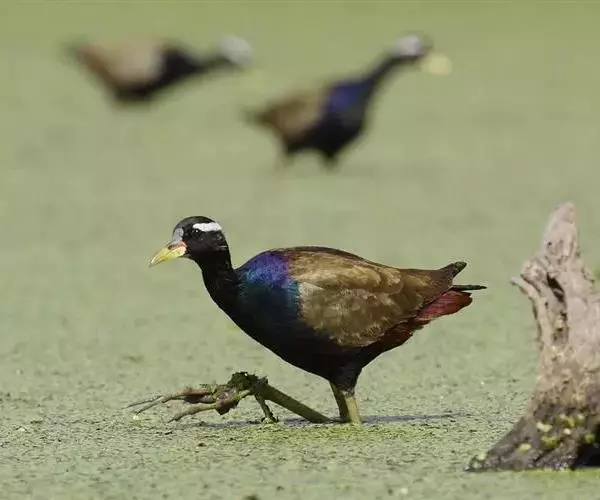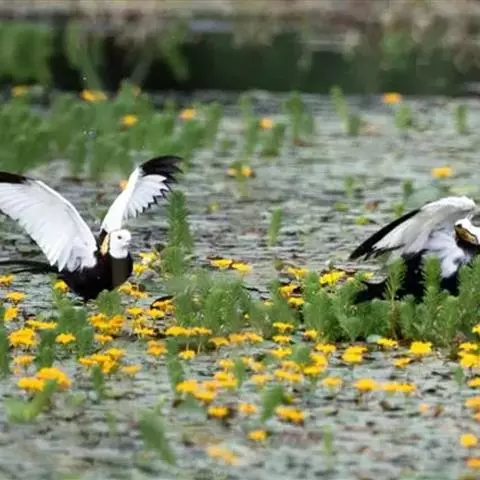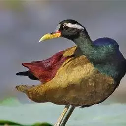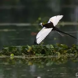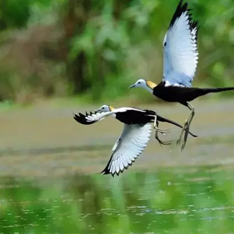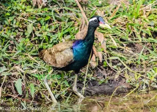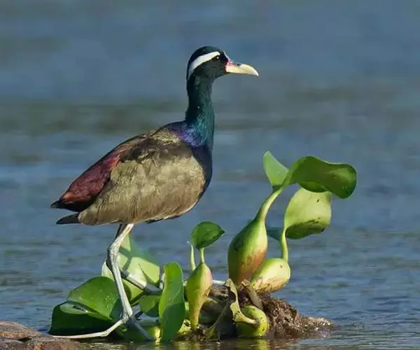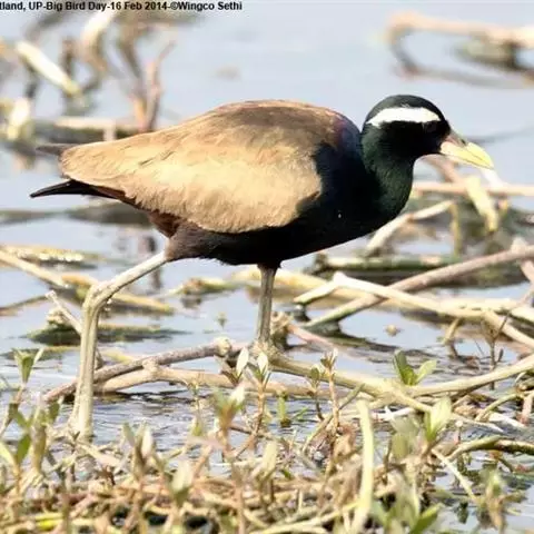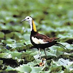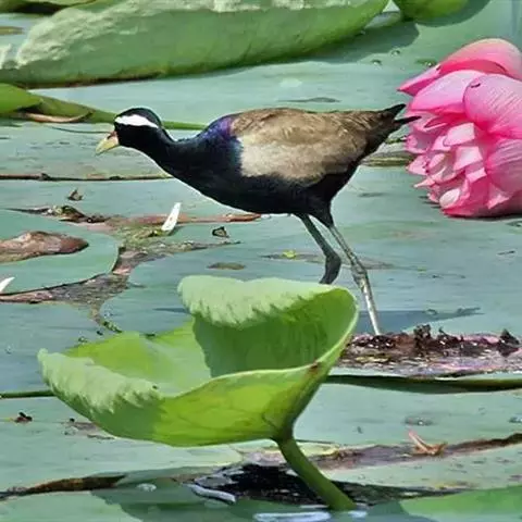铜翅水雉(学名:Metopidius indicus):是小型涉禽,体长28-31厘米。头颈、下体黑色,具金属色辉。从眼到颈有白色纵纹,背、内侧初级一飞羽橄榄铜绿色,尾下覆羽栗色。跗蹠的前后均有盾状鳞,趾、爪均甚长,后爪特别长。栖息于热带开阔的田坝区,单个或成对在沼泽湿地中活动觅食。捕食昆虫、蜗牛、小鱼和水生植物。配偶为一雌多雄制,雌鸟常常拥有很多个雄鸟。雄鸟的领域性极强,常常为保卫领域而彼此争斗。7-8月产卵,巢用杂草铺垫而成,每窝产卵4枚。