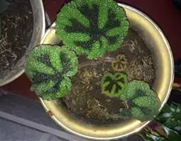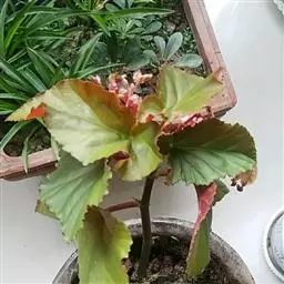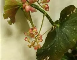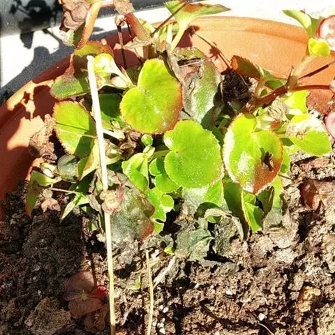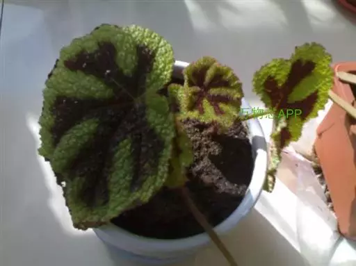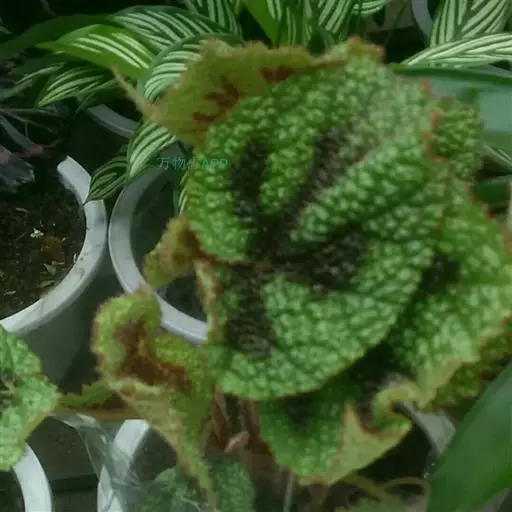真菌病害,由葡萄孢菌引起的灰霉病症状:秋海棠叶片灰霉病经常发植株的下部,尤其是根茎处与基质接触的地方更容易感染病菌,被水浸润的病斑很快会扩散到整个叶整个植株,受害区域呈现坏死斑点,逐渐由褐色转变为黑色。当夜间温度较低、白天温度较高而且湿高时,病原孢子生长加快,受害的叶片上会长出灰绿色的霉状物。