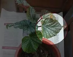 由漆斑菌引起的秋海棠叶斑病症状:病症一般出现在秋海棠叶片边缘、叶尖和破损叶片的叶脉上。坏死区域呈现黑褐色,然后是水渍状。诊断方法是下部的叶片经常会不规则形状的孢子群,中央呈黑色,但边缘为白色。