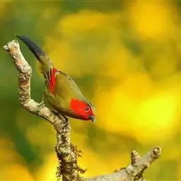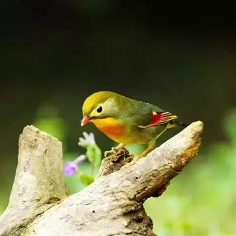 银耳相思鸟小型鸟类,体长14~18厘米。头顶黑色,耳羽银灰色,前额橙黄色;外侧飞羽橙黄色,基部朱红色,…