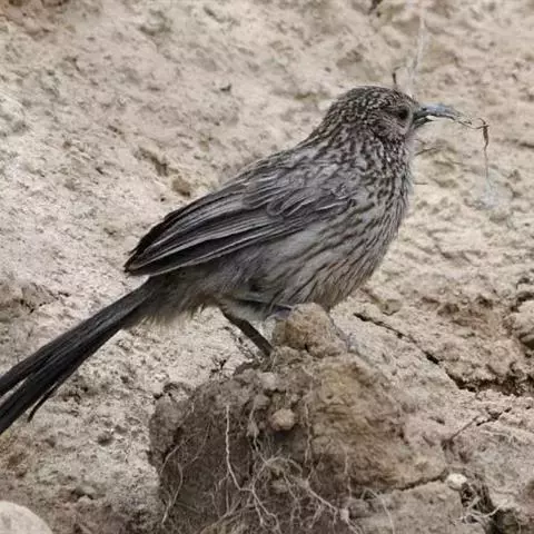 大草鹛中型鸟类,体长31~34厘米。上体灰色具粗著的黑褐色条纹,腰和尾上覆羽纵纹不明显。颊和耳羽灰色,…