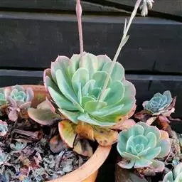 大和锦是景天科拟石莲花属的多肉植物。肉质叶排成紧密的莲座状,广卵形至散三角卵形,背面突起呈龙骨状,…
