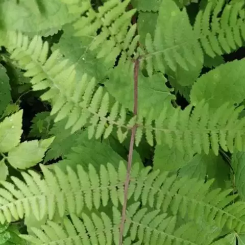 植株高约2米。根状茎长而横走,粗壮,粗达5毫米,密被栗褐色鳞片;鳞片质厚光泽,披针形,先端往往扭曲。叶大,疏生;柄长约1米,基部粗达5毫米,圆形,红色,有光泽,基部具微细疣状突起而略粗糙,向上平滑;叶片三角形或长圆状三角长50-100厘米,二至三回羽状;羽片对生,平展或斜展,或上部的旱镰刀形而斜向无柄,基部有托叶状的小羽片1对,基部一对羽片通常较大,一般中型植株的基部羽片25-45厘米,宽13-30厘米,长三角形,先端尖,基部截形,一回羽状或二回深羽裂;羽片多数,对生,平展,无柄,下部1-3对较大,或第二、第三对较大而基部一对略缩长10-15厘米,宽3-4厘米,披针形或长圆披针形,长尾头(尾长2.5-4厘米),截形至阔楔形,一回羽状或深羽裂达小羽轴;裂片6-9对,对生,平展或略斜展,通常二对较大,长约1.5-4厘米,宽5-8毫米,长圆形或长圆披针形,钝头或短渐尖,基部小羽轴多少合生,两侧略膨大,下侧多少下延,有狭翅相连或彼此远分离而小羽轴无翅,间隔与裂片等宽或较宽,全缘或羽裂达1/2,边缘波状或具波状圆齿;第二对距基部一对10厘米以上,和基部一对同形,向上各对羽片均略变小。叶脉网状,网眼角形或六角形,沿主脉及小羽轴两侧的1列网眼较长而整齐,向叶边的较小,两面显。叶干后草质或纸质,上面褐绿色,下面灰绿色或浅灰色,均无毛;叶轴及各回羽由栗红色渐变为棕禾秆色以至禾秆色,有光泽,无毛,上面有浅纵沟。