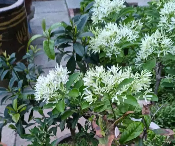 聚伞状圆锥花序,长3-12厘米,顶生于枝端,近无毛;苞片线形,长2-10毫米,疏被或密被柔毛,花长1.2-2.5厘米,单性而雌雄异株或为两性花;花梗长0.5-2厘米,纤细,无毛;花萼长1-3毫米,4深裂,裂片尖三角形或披针形,长0.5-2.5毫米;花冠白色,4深裂,裂片线状倒披针形,长(1-)1.5-2.5厘米,宽0.5-3.5毫米,花冠管短,长1.5-4毫米;雄蕊藏于管内或稍伸出,花丝长在0.5毫米之下,花药长卵形,长1.5-2毫米,药隔突出;子房卵形,长1.5-2毫米,柱头球形,稍2裂。