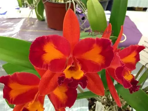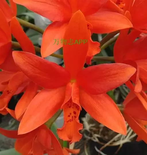卡特兰(红色) 大部分由蕾丽兰亚族的蕾丽兰、卡特兰、白拉索兰中的2~3种杂交而成,也有原生卡特兰,如走路人(Cattleyawalkeriana)。 多年生草本。假鳞茎棍棒状,长10~15厘米,顶生叶片,革质,淡绿色,花大紫红色。栽培品种色彩丰富,有白、黄、橙红、深红、紫红和复色。常见品种有黄色的“香山”、“落曰”,绿色的“榆林”,白色的“优美”,粉红色的“真美”,红色的“火球”,紫红的“长河”、双色的“圣诞糖果”等。