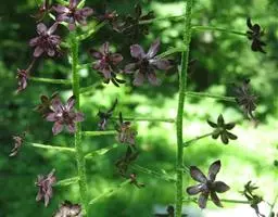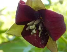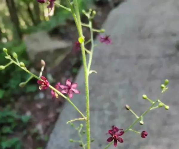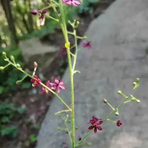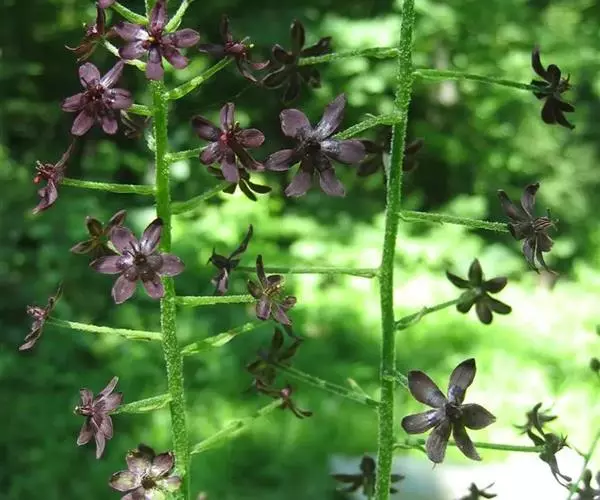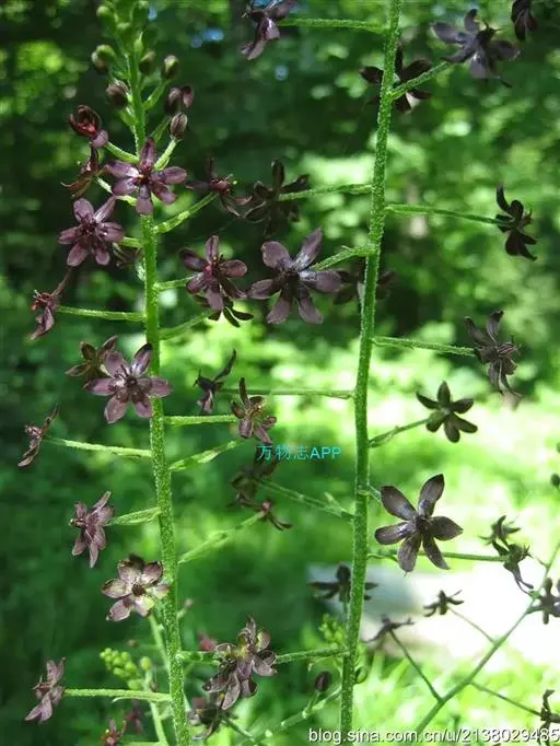 圆锥花序通常疏生较短的侧生花序,最下面的侧生花序偶尔再次分枝;总轴和枝轴密生绵状毛;花多数,疏生;花被片黑紫色,开展或反折,近倒卵状矩圆形,通常长5-7毫米,宽2-3毫米,先端钝,基部无柄,全缘;花梗长约为花被片的2倍,长可达1厘米或更长,在侧生花序上的花梗比顶生花序上的花梗短;小苞片长3-4毫米,背面和边缘生毛;雄蕊长约为花被片的一半;子房无毛。