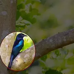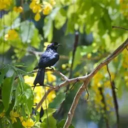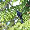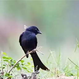 发冠卷尾是中型鸟类,体长28-35厘米。通体绒黑色缀蓝绿色金属光泽,额部具发丝状羽冠,…