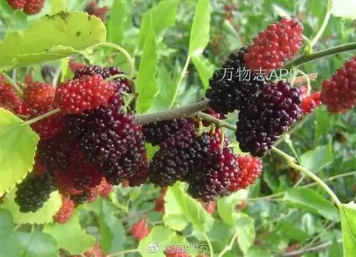 桑椹嫩时色青,味酸,老熟时色紫黑,多汁,味甜。中医学认为桑椹补益肝肾,滋阴养血,息风,具有主治心悸失眠、头晕目眩、耳鸣、便秘盗汗、瘰疬、关节不利等病症。 桑葚-原植物