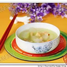 3 虾仁随冷水入锅煮至酥烂再加冬瓜同煮至冬瓜熟,少许盐、鸡精调味后盛入场碗。(调味品尽量少放)