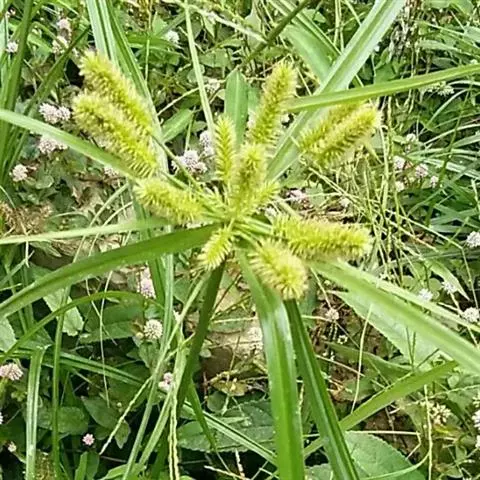 香附子(学名:Cyperus rotundus L.)是莎草科、莎草属植物。匍匐根状茎长,具椭圆形块茎。秆稍细弱,高15-95厘米,锐三稜形,平滑,基部呈块茎状。叶较多,短于秆,宽2-5毫米。叶状苞片2-3(-5) 枚,常长于花序,或有时短于花序;小穗斜展开,线形。小坚果长圆状倒卵形,具细点。花果期5-11月。