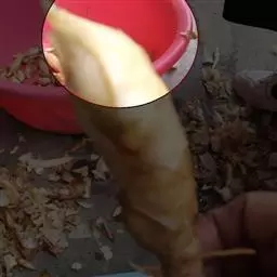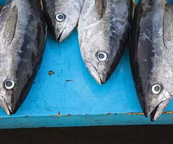 另外,过去船上钓取蓝点马鲛还有一法,即一条小船通过二人合作,一人摇橹,一人站立船头观察鱼情,当发现鱼情时,摇橹加速,当追至钓组能达到蓝点马鲛群外延位置时,可改为一人掌橹,一人钓鱼。技术好的还可以一边摇橹一边甩线施钓。