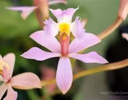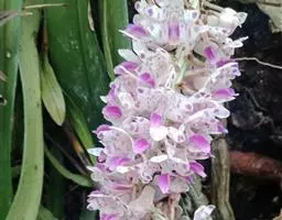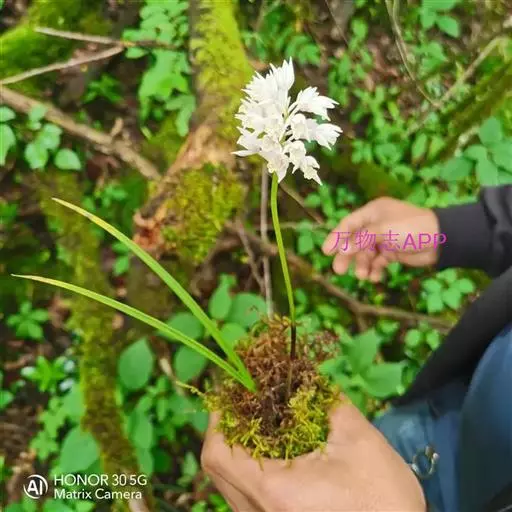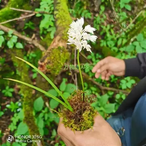 花葶从假鳞茎侧面发出,直立,长20-30厘米,中下部有2-3枚筒状鞘;总状花序通常多少缩短,长2-6厘米,具较密集的花;花苞片卵状披针形,长3-5毫米;花梗和子房长7-12毫米;花10余朵或更多,通常白色并有紫纹;萼片长圆状披针形,长9-11毫米,宽2.5-3.5毫米,先端渐尖;侧萼片斜歪并略宽于中萼片。