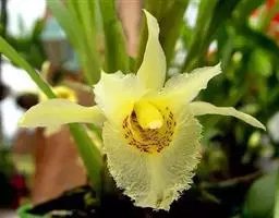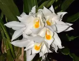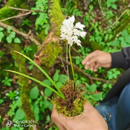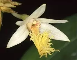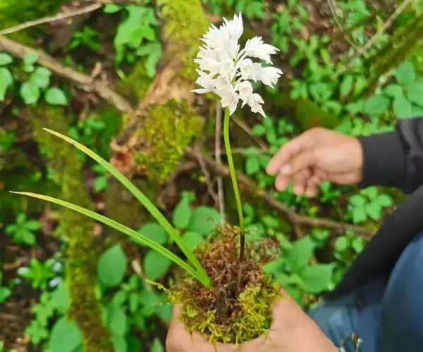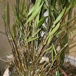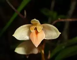 长叶山兰 长叶山兰的假鳞茎椭圆形至近球形,长1-2.5厘米,直径1-2厘米,有2-3节,外被撕裂成纤维状的鞘。叶2枚,偶有1枚,生于假鳞茎顶端,线状披针形或线形,长20-28厘米,宽0.8-1.8厘米,纸质,先端渐尖,基部收狭成柄,有关节,关节下方由叶柄套迭成假茎状,长3-5厘米。