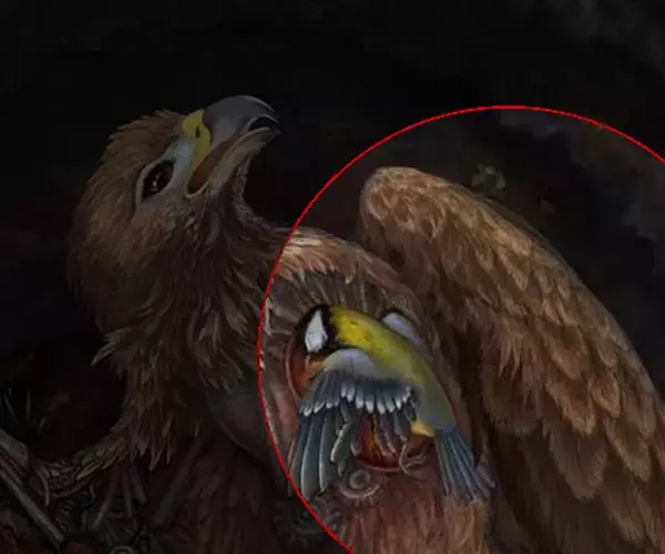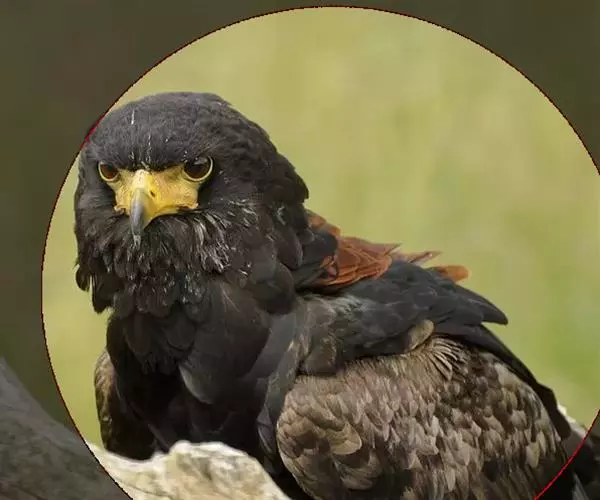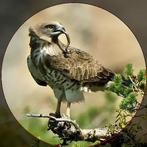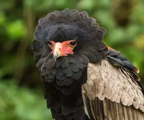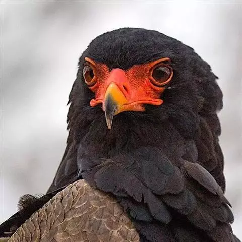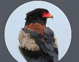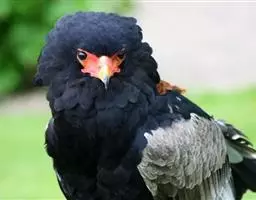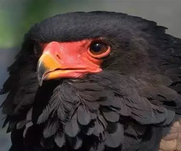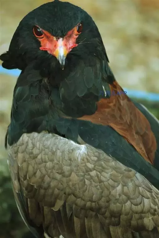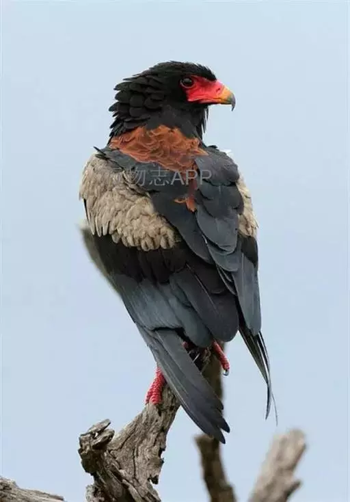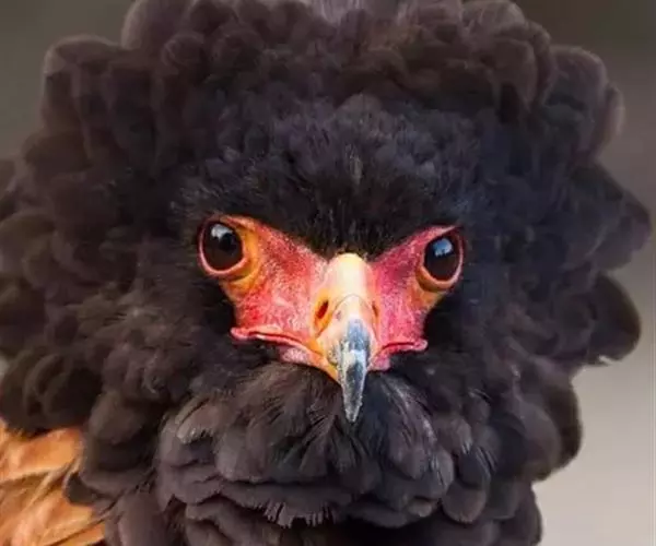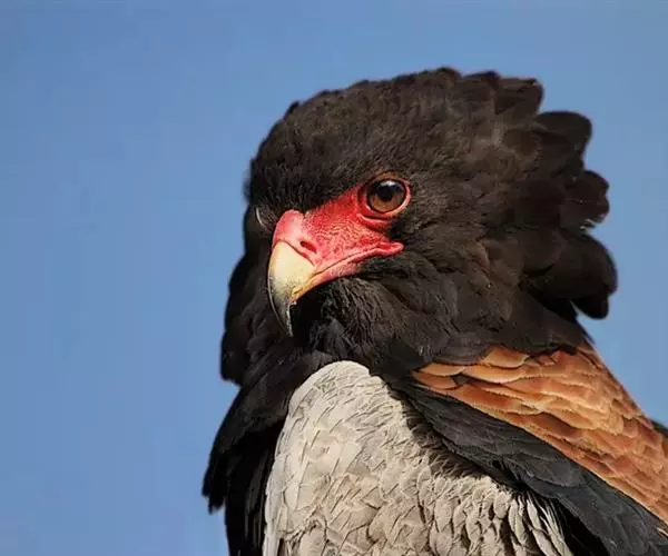 短尾雕也是一种大型食蛇的猛禽,在俄文里它被称为“小丑雕” (ОРЁЛ-СКОМОРОХ),因为它像马戏团的小丑将脸庞涂抹的红彤彤的,而且它还“套了一条鲜红色紧身裤”(它的腿也是红色的)。它的翅膀长而尾巴短,当它静止时收拢的翅膀完全掩蔽了尾部,好象它的尾巴一样。有人说短尾雕是飞机的原型。它身上的羽毛以黑色为主,椭圆的一枚枚羽毛支棱着,蓬松、美丽。在它的背上装饰着两块棕色的斑块,每一枚羽毛有清晰的圆形的羽缘,象精致的花边。