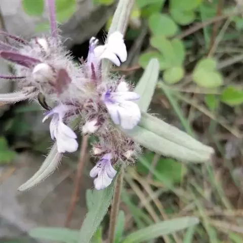 线叶筋骨草(5张) 多年生草本, 直立, 具分枝, 全株被白色具腺长柔毛或绵毛, 高25-40厘米, 根部膨大, 木质化。茎四棱形, 淡紫红色, 基部木质化, 嫩枝绿色, 多毛。叶柄极短, 具狭翅及槽;叶片纸质或近膜质, 线状披针形或线形, 长4-9厘米, 宽0.5-1.5厘米, 先端极钝或圆形, 基部渐狭, 下延, 抱茎, 边缘多少有缺刻或具波状齿, 具长柔毛状缘毛, 上面被疏糙伏毛, 下面通常于叶脉上被毛, 中脉在上面平或微凹, 下面显著。轮伞花序在茎中部以上着生, 向上渐密, 排列成穗状花序;苞叶与茎叶同形, 无柄。花萼漏斗状, 长6-7毫米, 外面在齿上毛最多, 内面无毛, 萼齿5, 狭三角形或线状狭披针形, 长为花萼的3/5, 整齐, 先端渐尖, 密具长柔毛状缘毛。花冠白色或淡蓝色, 具紫蓝色斑点, 筒状, 挺直, 藏于萼内, 两面被疏微柔毛, 内面近基部有毛环, 冠檐二唇形, 上唇极短, 直立, 圆形, 先端微缺, 下唇宽大, 伸长, 长6-8毫米, 3裂, 中裂片扇形, 先端圆形或微凹, 侧裂片线状长圆形。雄蕊4, 二强, 弯曲, 伸出, 花丝几无毛。花柱粗壮, 无毛, 与雄蕊等长或略短, 先端2浅裂, 裂片细尖。花盘环状, 裂片不明显, 前面呈指状膨大。子房4裂, 无毛。小坚果倒卵状或长倒卵状三棱形, 背部具网状皱纹, 腹部几为果脐所占。花期4-5月, 果期5月以后, 有的植株11月仍有花果。