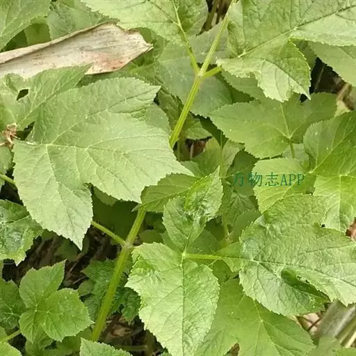 多年生草本,高1-2米。根圆锥形、粗大,多分歧,灰棕色。茎直立,有棱槽,上部开展分枝。叶有柄,长10-30厘米;叶片轮廓广卵形,薄膜质,三出式分裂,裂片广卵形至圆形、心形、不规则的3-5裂,长10-20厘米,宽7-18厘米,裂片边缘具粗大的锯齿,尖锐至长尖,小叶柄长3-8厘米;茎上部叶有显著宽展的叶鞘。