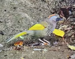 银耳相思鸟小型鸟类,体长14~18厘米。头顶黑色,耳羽银灰色,前额橙黄色;外侧飞羽橙黄色,基部朱红色,…