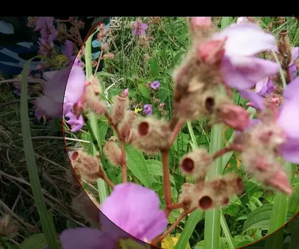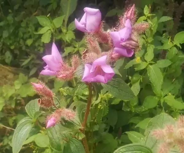 聚伞花序,生于小枝顶端,近头状或圆锥状,长可达7厘米;苞片广卵形,长8-10毫米,具刺毛状缘毛,背面被糙伏毛;花梗极短,被糙伏毛; 花萼长约2厘米,被刺毛状篦状毛及少数具柄星状毛,毛常平贴,裂片广披针形或狭三角形,顶端长渐尖,长约8毫米,背面被糙伏毛及疏缘毛;花瓣紫红色或粉红色,卵形,顶端急尖,长1-1.3厘米,全缘,无缘毛;雄蕊常偏向1侧,花丝较花药短,花药顶端具喙,喙长约为花药长的1/3,药隔基部膨大,后方下延呈短距;子房卵形,顶端有1圈刚毛,其余被糙伏毛。