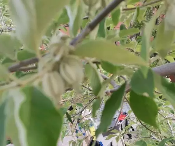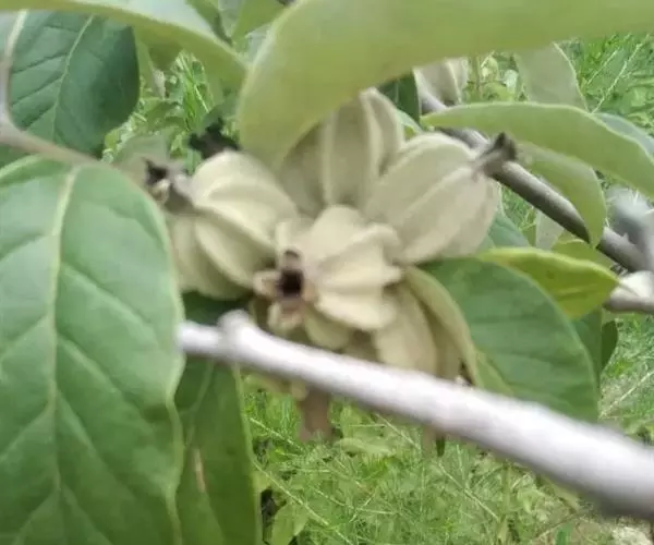 花灰绿。色,下垂,芳香,密被灰白色星状绒毛;常1-3(-5)花簇生幼枝叶腋;花梗被星状柔毛,长3-4毫米;萼筒钟状,长5毫米,在子房上骤收缩,裂片近三角形或近披针形,长3.5-4毫米,顶端渐尖或钝尖,内面疏生白色星状柔毛,包围子房的萼管短矩圆形或近球形,被星状绒毛和鳞片,具明显的8肋;雄蕊4,花药椭圆形,长1.6毫米;花柱直立,上部稍弯曲,下部密生绒毛。果实近圆形或阔椭圆形,长13毫米,具明显的8棱脊,翅状,果肉棉质;果核纺锤形,栗褐色,内面具丝状棉毛;子叶肥厚,含丰富的油脂。花期4-5月,果期8-9 月。