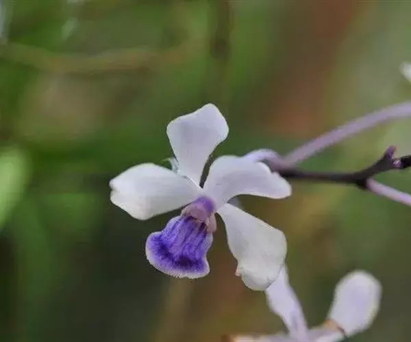 花序近直立,长达36厘米,不分枝;花序轴长10-25厘米,疏生许多花;花序柄粗壮,粗2-4毫米,被3枚鞘;花苞片小,卵状三角形,长1.5-3毫米;花梗和子房均纤细,白色带淡蓝色,长约2.5厘米;花中等大,伸展,萼片和花瓣淡蓝色或白色带淡蓝色晕;萼片近相似,倒卵形或匙形,长15-17毫米,宽6-7毫米,先端钝,基部楔形;花瓣倒卵形,长15-17毫米,宽5-6毫米,先端钝,基部楔形;唇瓣深蓝色,3裂;侧裂片直立,近长圆形,长4毫米,宽2.3毫米,先端斜截;中裂片楔状倒卵形,长7-7.5毫米,宽约6毫米,先端扩大呈圆形,其中央稍凹缺,基部具一对胼胝体,上面通常具4-5条脊突,其中有2条较粗而在先端扩大成圆钝状并且颜色更深;距短而狭,伸直或稍向前弯,长约5毫米;蕊柱蓝色、粗短,长约5毫米;药帽淡黄色。花期3-4月。