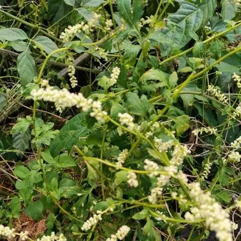 薇甘菊为多年生草质或木质藤本,茎细长,匍匐或攀缘,多分枝,被短柔毛或近无毛,幼时绿色,近圆柱形,老茎淡褐色,具多条肋纹。茎中部叶三角状卵形至卵形,长4.0-13.0厘米,宽2.0-9.0厘米,基部心形,偶近戟形,先端渐尖,边缘具数个粗齿或浅波状圆锯齿,两面无毛,基出3-7脉;叶柄长2.0-8.0厘米;上部的叶渐小,叶柄亦短。