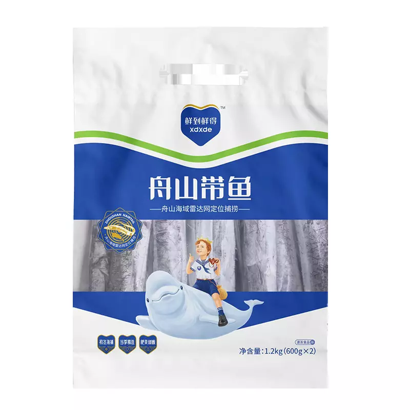 带鱼,体带状,侧扁。前部背腹缘几平行,体长一般50-70cm,大者长达120cm。头狭长,尖突吻尖长。眼中大,位高,眼间隔平坦,中央微凸。口大;平直,口裂后缘达眼下方。下颌长于上颌,突出。牙强大,侧扁而尖,两颌前端各有2对倒钩状大犬牙,上颌具侧牙10-13颗;下颌具侧牙12-14颗。鳃孔宽大,鳃耙(8-14)+(15-24),细短。体表银灰色,无鳞,但表面有一层银粉,侧线在胸鳍上方向后显著弯下沿腹线直达尾端。 体光滑,鳞退化为银膜。侧线于胸鳍上方显著下弯,沿腹缘伸达尾端。背鳍1285-145,起点在头后部,延达尾端。臀鳍88-13-13,完全由分离小棘组成,仅棘尖外露,第1鳍棘甚小。胸鳍11-12,短尖而低。无腹鳍。尾鞭状,尾鳍消失。体银白色,背鳍上关部及胸鳍浅灰色,具细小黑点。尾暗黑色。脂肪较多且集中于体外层。