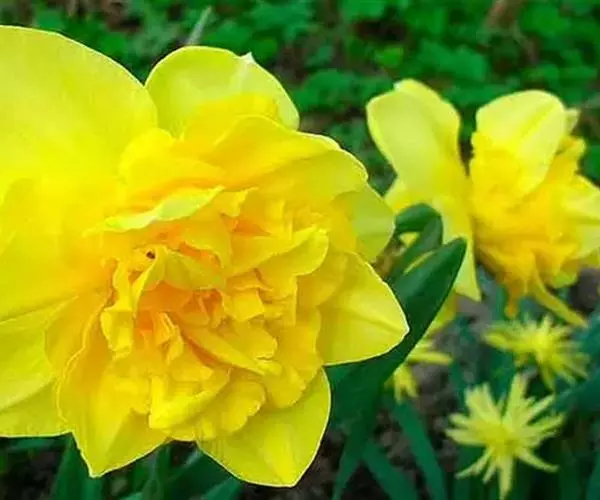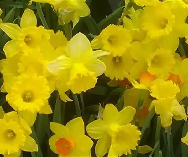 黄花重瓣的有迪克·怀尔登、副冠深橙色的塔希提、副冠橙色的得克萨斯和多头的黄乐。