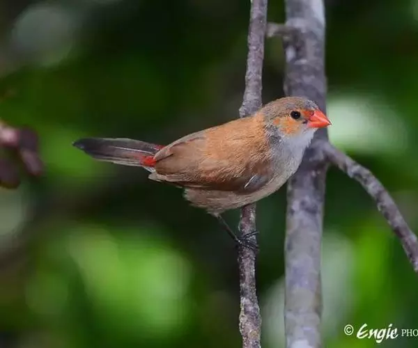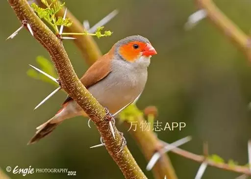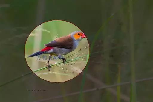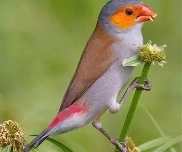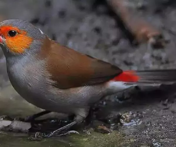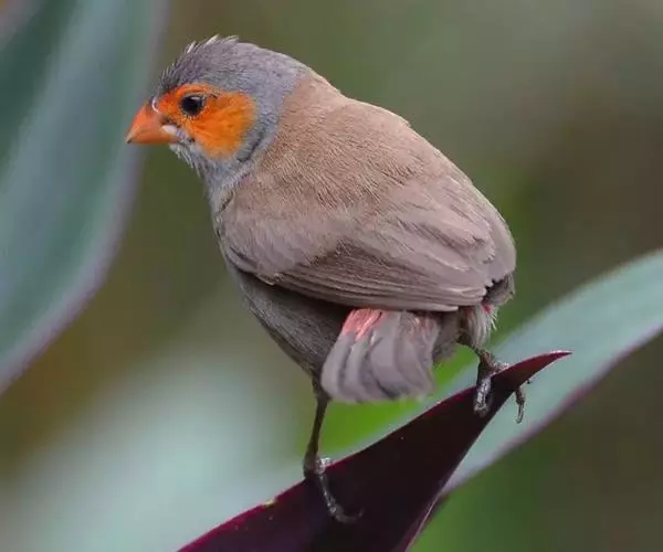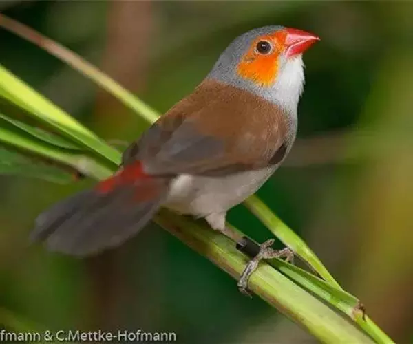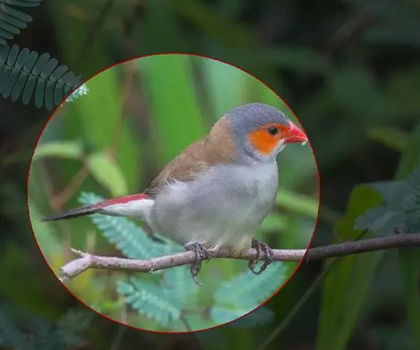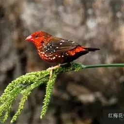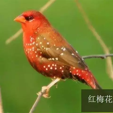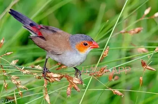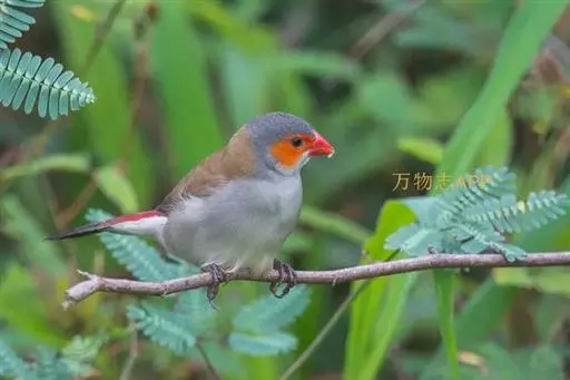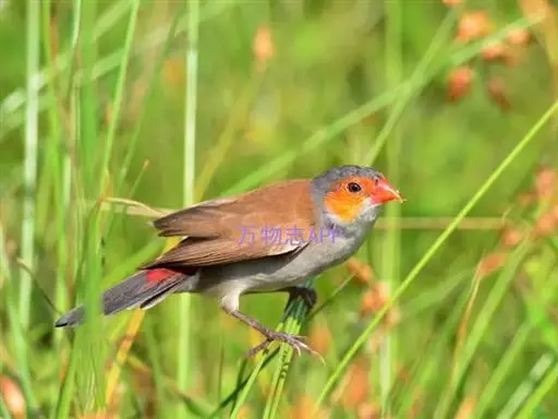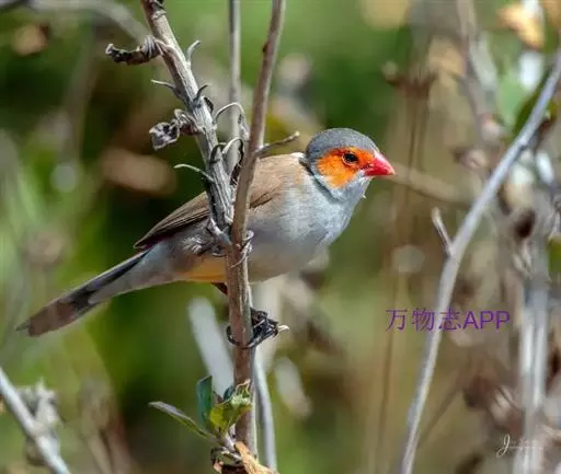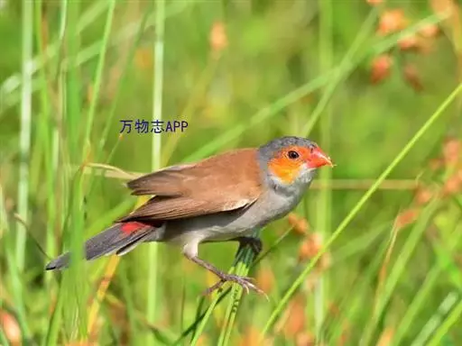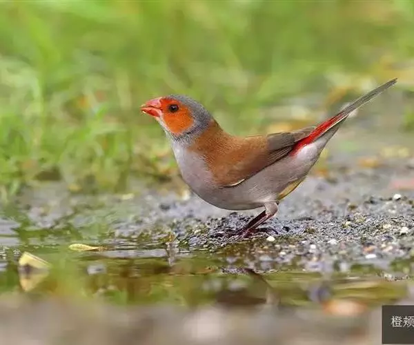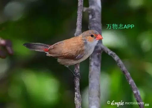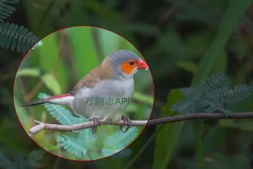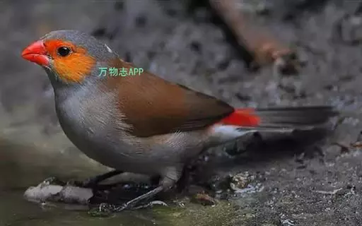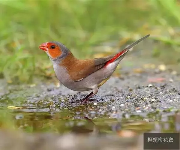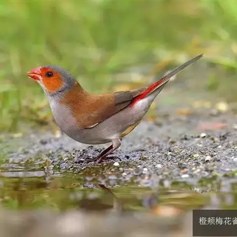 尾上覆羽:雄鸟具红色的尾上覆羽,此为橙颊梅花雀独有的特征
