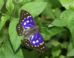 大紫蛱蝶为大型蝶种,翅展约86~110mm。翅紫黑色,有白色斑点点缀其中,雄蝶的翅具强烈紫色虹彩,…