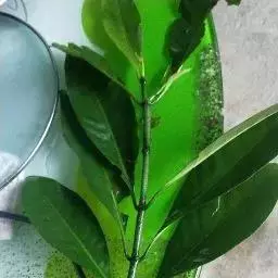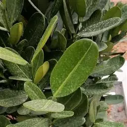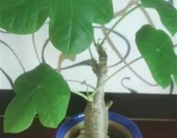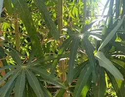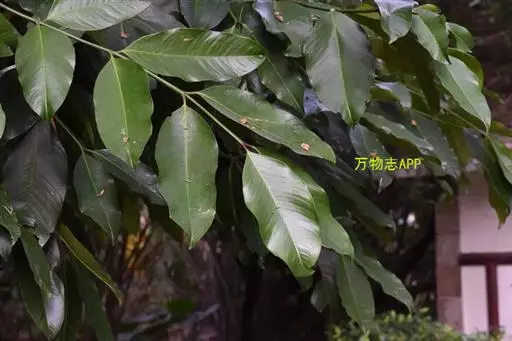叶两行排列,厚革质,具光泽,椭圆形、长圆形或长方状披针形,长(14-)20-34厘米,宽(4-)6-12厘米,顶端急尖或钝,稀渐尖,基部楔形或宽楔形,中脉粗壮,两面隆起,侧脉密集,多达35-40对,网脉明显;叶柄粗壮,基部马蹄形,微抱茎,枝条顶端的1-2对叶柄通常玫瑰红色,长1.5-2.5厘米,干后有稜及横皱纹。