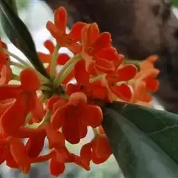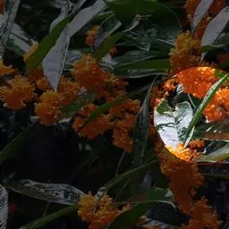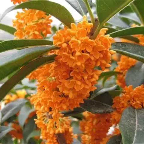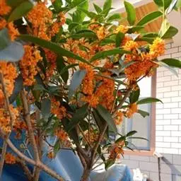 波叶金桂:叶椭圆形,边缘波状起伏,秋季可开花2-3次,着花紧密,有浓香,花冠金黄色,花瓣椭圆形。