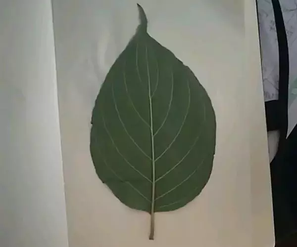 叶对生,纸质,椭圆形、长圆椭圆形或阔卵形,长4-12(-15.5)厘米,宽1.7-5.3(-8)厘米,先端渐尖,基部楔形,有时稍不对称,上面深绿色,稀被贴生短柔毛,下面淡绿色,密被灰白色贴生短柔毛,中脉在上面明显,下面凸出,侧脉4(-5)对,弓形内弯,在上面稍明显,下面凸起;叶柄长(0.8-)3.5厘米,幼时被有短柔毛,后渐无毛,上面平坦,下面圆形。