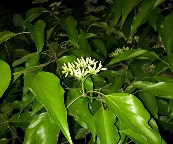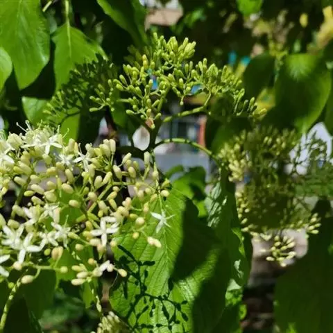 伞房状聚伞花序顶生,花密,宽7-9厘米,被灰白色短柔毛;总花梗长1.2-2厘米;花白色,有香味,直径9.5毫米;花萼裂片4,绿色,齿状三角形,长约0.4毫米,与花盘近于等长,外侧被有黄白色短柔毛;花瓣4,长圆披针形,长4.5-5毫米,宽1.2-1.5毫米,上面无毛,下面有贴生短柔毛;雄蕊4,无毛,长4.8-5毫米,花丝线形,微扁,长4毫米,花药淡黄色,长圆卵形,2室,长1.5-2毫米,丁字形着生;花盘明显,垫状或腺体状,无毛;花柱棍棒形,长3.5毫米,被有稀疏的贴生短柔毛,柱头小,头状,子房下位,花托倒卵形,长1.2-1.5毫米,直径1-1.1毫米,密被灰白色贴生短柔毛;花梗细圆柱形,长0.8-2.7毫米,有稀疏短柔毛。
