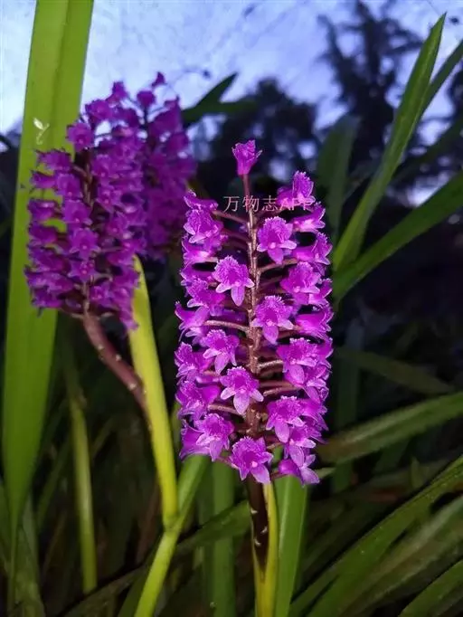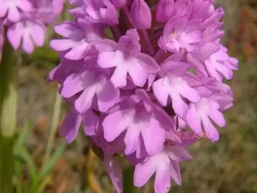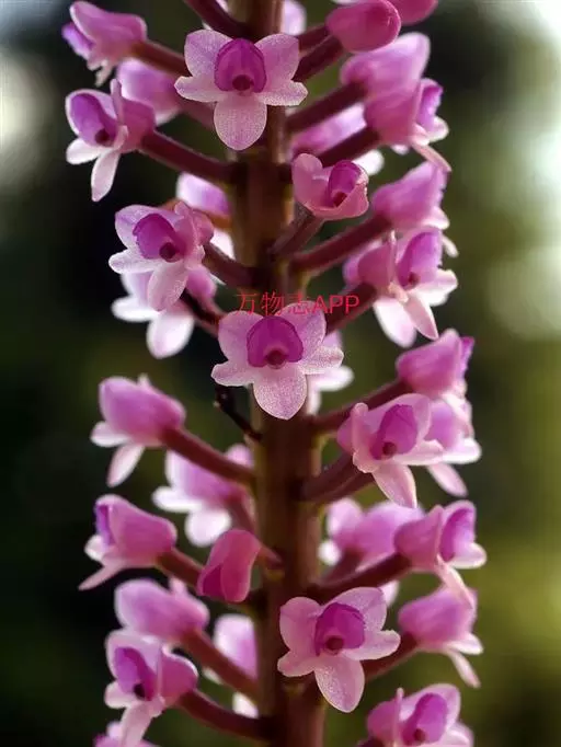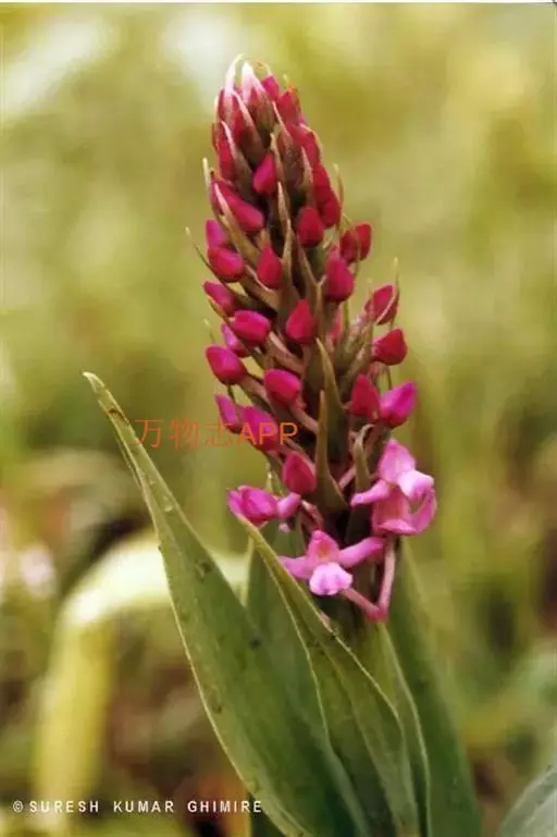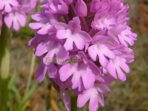 总状花序具多数密生的花,圆柱形,长5.5-15厘米;花苞片披针形,直立伸展,先端长渐尖成尾状,长于或等长于花;子房纺锤形,顶部稍弧曲,连花梗长约8毫米;花粉红色,罕为粉白色;中萼片宽椭圆形或宽卵状椭圆形,长3.5-5毫米,宽3-4毫米,先端急尖,略呈兜状,具3脉;侧萼片斜卵形,反折,边缘向外卷,较中萼片稍长或几等长,先端急尖,具3脉,前面的1条脉常具支脉;花瓣直立,斜卵状三角形,与中萼片等长,与侧萼片近等宽,边缘具细锯齿,先端急尖,具3脉,前面的1条脉常具支脉,与中萼片相靠;唇瓣向前伸展,宽倒卵形,长4-5毫米,前部3裂,中裂片较侧裂片大,三角形,先端钝或急尖;距细而长,狭圆筒形,下垂,长约1厘米,稍向前弯,向末端略增粗或略渐狭,长于子房;花粉团卵球形,具细长的柄和粘盘,粘盘线状披针形。花期6-8月。