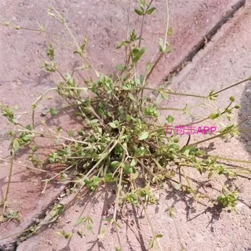 无瓣繁缕 茎通常铺散,有时上升,基部分枝有1列长柔毛,但绝不被腺柔毛。叶小,叶片近卵形,长5-8毫米,有时达1.5厘米,顶端急尖,基部楔形,两面无毛,上部及中部者无柄,下部者具长柄。