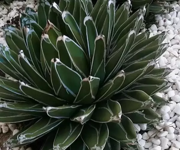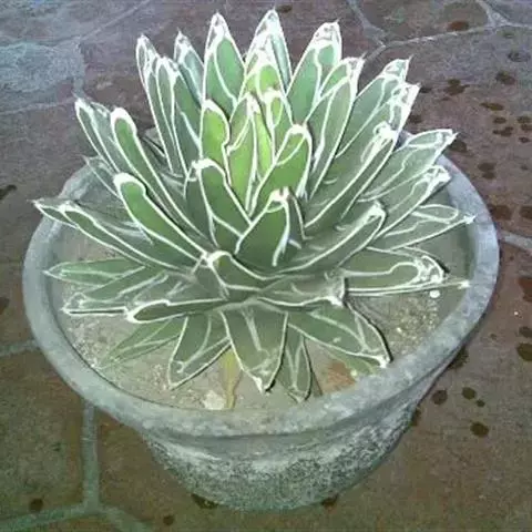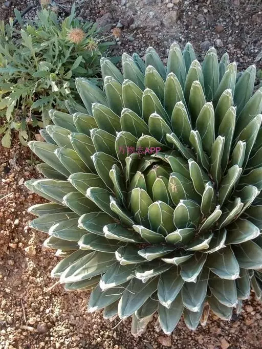 肉质草本。植株无茎,肉质叶呈莲座状排列,株幅可达40厘米;大型植株叶片可达100多枚,叶三角锥形,长10~15厘米,宽约5厘米,先端细,腹面扁平,背面圆形微呈龙骨状凸起;叶绿色,有不规则的白色线条,叶缘及叶背的龙骨凸上均有白色角质,叶顶端有0.3~0.5厘米坚硬的黑刺。植株生长30年左右才能开花,松散的穗状花序高达4米,小花淡绿色,长约5厘米;花后结籽,植株则枯萎死亡。其种名"victoriae-reginae"是纪念维多利亚女王,国外也称之为维多利亚龙舌兰、女王龙舌兰、皇后龙舌兰。