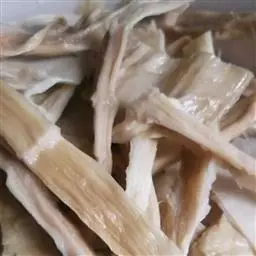 2.将火腿切成5块,猪肉切6块,鸡脚用沸水略烫后,剥去外皮,剁去趾甲,敲断脚骨,洗净,将可仁放入碗内洗净。