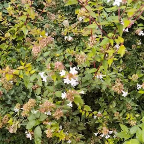 大花六道木图片2 金边大花六道木(A.grandiflora‘FrancisMason’),是由大花六道木杂交而成,与亲本相比,最大的特色在于叶面呈金黄色。小枝条红色,中空。花小,繁茂,并带有淡淡的芳香,是大花六道木中最好的品种之一。