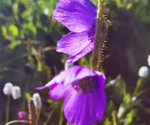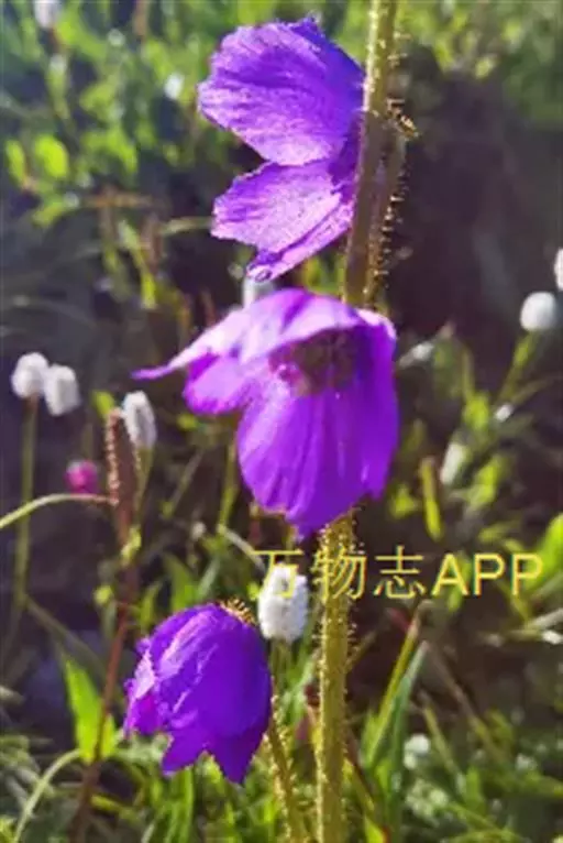 花茎粗壮,中间粗,两端渐狭,具数条细纵肋,疏被黄褐色硬毛;花数朵于花茎上排列成总状花序,无苞片,有时单生于基生花葶上;花梗长0.5-3厘米,通常密被硬毛。花芽近圆形或长圆形,直径0.5-1厘米;萼片外面疏被锈色硬毛;花瓣4-8,倒卵形、近圆形或卵圆形,长1-3厘米,宽0.7-3厘米,先端圆或急尖,有时具细锯齿,紫色或蓝色;花丝丝状,长0.5-1厘米,与花瓣同色,花药长圆形,长1-1.5毫米,黄色至黑褐色;子房长圆形、椭圆状长圆形或椭圆形,被黄褐色、伸展的刺毛,稀无毛,花柱长1-2毫米,柱头头状,淡黄色,(2-)3-4(-6)裂。蒴果狭倒卵形、长圆状椭圆形、狭长圆形或稀近圆柱形,长1.5-3.5厘米,绿色,成熟时褐色,花柱及果肋深紫色,无毛或被黄褐色硬毛,3-5瓣自顶端开裂至全长的1/3。种子肾形或镰状椭圆形。花果期6-9月。