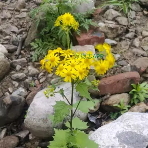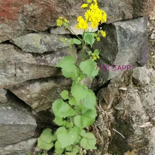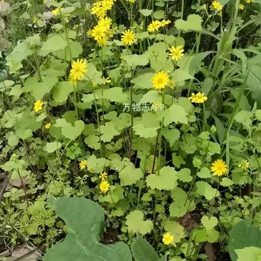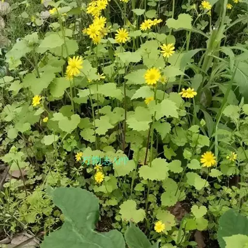 一年生或二年生草本,高30-80厘米。茎直立,单一或稍有分枝,具白色软毛或近乎光滑。基生叶丛生,花后脱落,柄长3-6厘米,基部具鞘;叶片肾圆形,长约2.5厘米,宽约3厘米,边缘具不整齐的三角形齿,上面稍有细毛,下面有白色蛛丝毛密生;中部叶有短柄,叶片肾圆形至广卵状心形,长3.5-4厘米,宽4-4.5厘米,先端短尖,被毛同基生叶;上部叶宽卵形,较小。春、夏季开花,头状花序小而多数,具细梗,排成伞房状;总苞钟形,基部无小苞,总苞片条状披针形,边缘膜质;缘花舌状,1层,舌片橘黄色,椭圆形,先端全缘或3齿裂;中央管状花多数,先端5裂。瘦果圆筒形,具纵棱,稍有细毛;冠毛白色,长约2-3毫米。