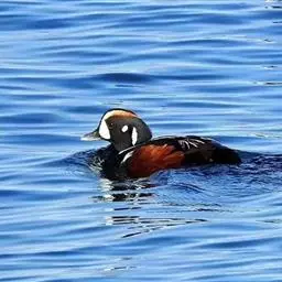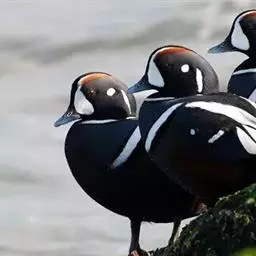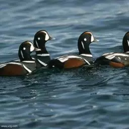 黑海番鸭 黑海番鸭雄鸟头、颈和上下体均黑色,上体微具光泽。翅下覆羽黑褐色和银灰色,尾黑色,长而尖。 雌鸟头顶和后颈暗褐色,头侧、颈侧、颏和喉灰白色,颈侧缀有细小淡褐色斑点,上体暗灰褐色,具灰白色端斑,胸侧和两胁也具灰白色端斑。胸和腹淡灰褐色,腹具少许不甚明显的灰白色斑纹。腋羽、肛周及尾下覆羽暗褐色;翼下覆羽暗灰褐色而具灰白色狭缘。