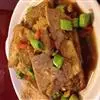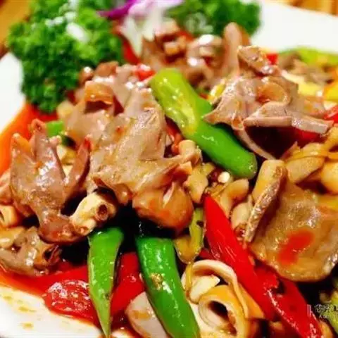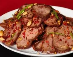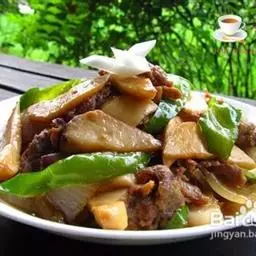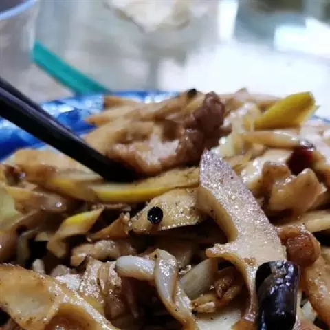 14.把煎好的猪肉片放入翻炒会,最后撒上少许鸡精即可出锅。