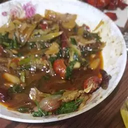 7、翻炒两分钟,放入一小碗的清水焖几分钟,至到水干后,将五花肉放进去煸炒1分钟即可。