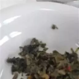 5、待豆角将熟,以盐、五香粉和鸡精调味,出锅前淋几滴麻油即可。