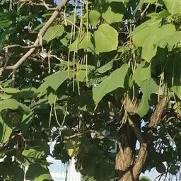 蒴果木质,常悬垂于树梢,长40-120厘米,宽5-9厘米,厚约1厘米,2瓣开裂,果瓣具有中肋,边缘肋状凸起。种子多数,圆形,连翅长6-7厘米,宽3.5-4厘米,周翅薄如纸,故有千张纸之称 。果期10月至翌年2月。