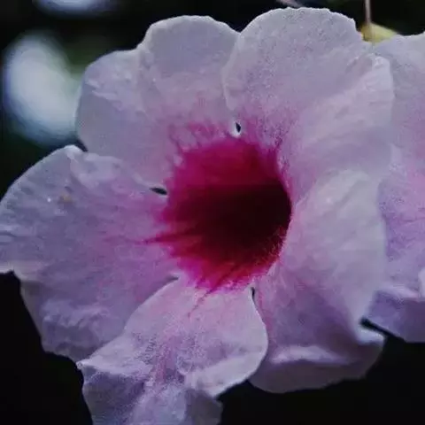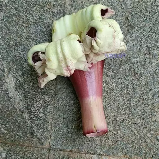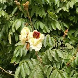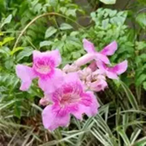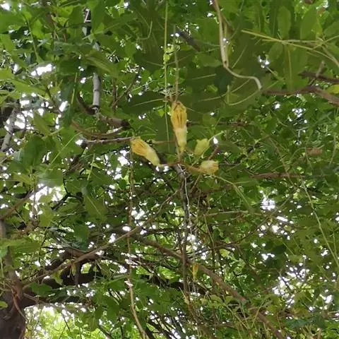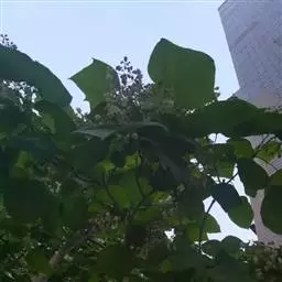木蝴蝶 直立小乔木,高6-10米,胸径15-20厘米,树皮灰褐色。大型奇数2-3 (-4)回羽状复叶,着生于茎干近顶端,长60-130厘米;小叶三角状卵形,长5-13厘米,宽3-10厘米,顶端短渐尖,基部近圆形或心形,偏斜,两面无毛,全缘,叶片千后发蓝色,侧脉5-6对网脉在叶下面明显。总状聚伞花序顶生,粗壮,长40-150厘米;花梗长3-7厘米;花大、紫红色。花萼钟状,紫色,膜质,果期近木质,长2.2-4.5厘米,宽2-3厘米,光滑,顶端平截,具小苞片。花冠肉质,长3-9厘米,基部粗1-1.5厘米,口部直径5.5-8厘米;檐部下唇3裂,上唇2裂,裂片微反折,花冠在傍晚开放,有恶臭气味。雄蕊插生于花冠筒中部,花丝长4厘米,微伸出花冠外,花丝基部被绵毛,花药椭圆形,长8-10毫米,略叉开。花盘大,肉质,5浅裂,厚4-5毫米,直径约1.5厘米。花柱长5-7厘米,柱头2片开裂,长约7毫米,宽约5毫米 ,花期7月至10月。