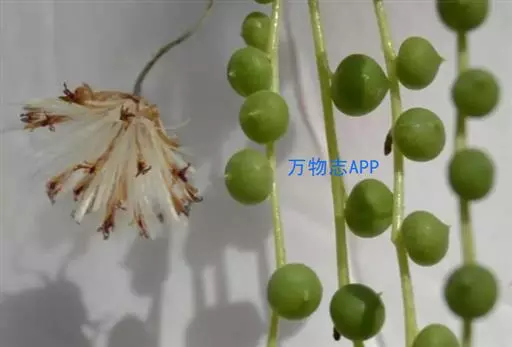 一粒粒圆润的、肥厚的圆心形叶片,似一串串风铃在风中摇曳,这就是它的叶子。因叶互生,生长较疏,圆 心形,深绿色,肥厚多汁,似珠子,故有“佛串珠”、“佛珠"、”绿葡萄“、”绿之铃“之美称。还有人称它为”佛珠吊兰“、”情人泪"。它的茎纤细,头状花序,顶生,长3~4厘米,呈弯钩形,花白色或褐色,花蕾是红色的细条。