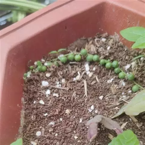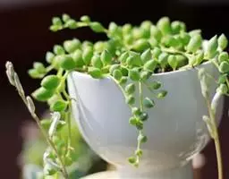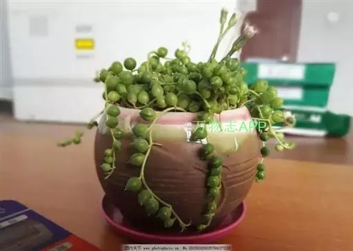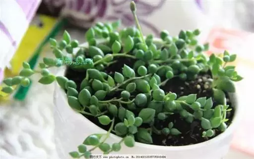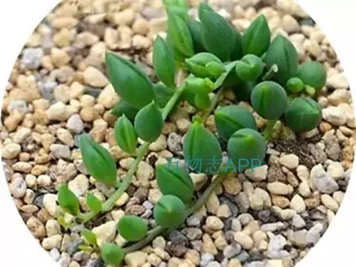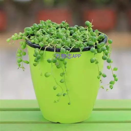 珍珠吊兰(Senecio rowleyanus H. Jacobsen) 因鼓鼓、饱满翠绿的椭圆形小叶子形似珍珠状而得名。又名翡翠珠、佛珠吊兰、翡翠珠、绿之铃,绿铃。菊科千里光属多肉植物,花期一般是当年的12月至翌年1月。