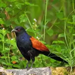 红翅凤头鹃:体长约38厘米,顶冠及凤头黑色,具显眼的直立凤头,背及尾黑色而带蓝色光泽,翅栗红色,…